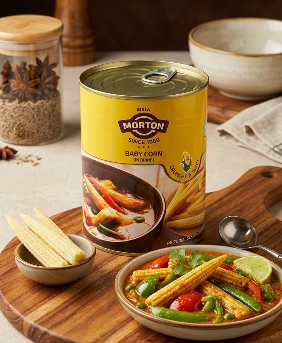 Morton Baby Corn in Brine is pre-cooked and packed in natural brine for long shelf life and convenience. These tender, mild-flavoured baby corns are perfect for stir-fries, salads, soups, and continental and Asian dishes. Simply open, drain, and add directly to your recipes.